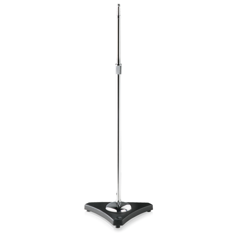 The AtlasIED MS25 heavy-duty studio recording stand features an integral air suspension system to protect sensitive microphones. Height extension up to 62" is achieved by an oversized 7/8" and 1 1/8" dia. tube assembly. Triangular cast base provides maximum stability and includes sculptured sides, ebony finish, and decorative chrome cover. Model MS-25 tube finish is chrome.