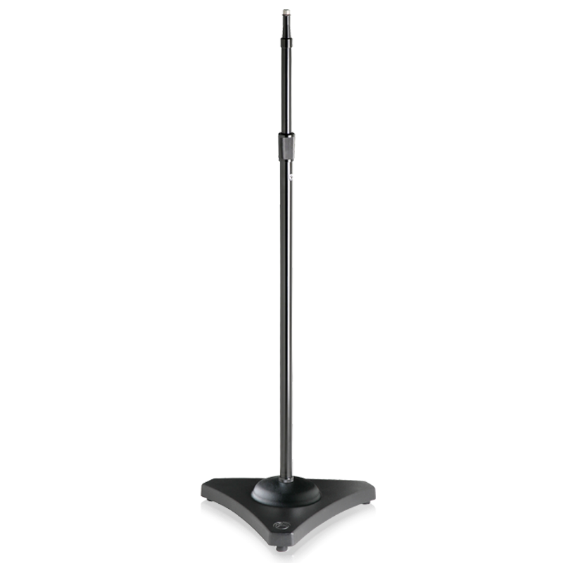The AtlasIED MS25E heavy-duty studio recording stand features an integral air suspension system to protect sensitive microphones. Height extension up to 62" is achieved by an oversized 7/8" and 1 1/8" dia. tube assembly. Triangular cast base provides maximum stability and includes sculptured sides, ebony finish, and decorative chrome cover. Model MS25E has an ebony tube finish.