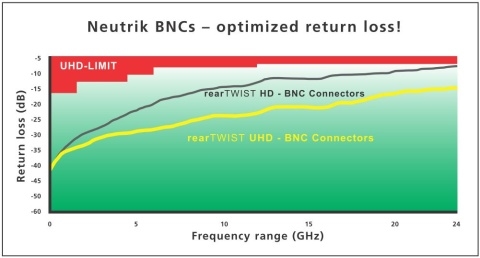Durch das optimierte Isolator-Design bietet der Neutrik rearTWIST UHD BNC Einbausteckverbinder mehr Spielraum bei verschlechterter Rückflussdämpfung im Vergleich zu herkömmlichen BNC Steckverbindern. Im Falle von Impedanz- Abweichungen resultierend aus kleinen Biegeradien, inkorrekter Steckermontage oder fehlerhaften Schnittstellenanbindungen bietet Neutriks rearTWIST UHD BNC genügend Reserven und gewährleistet eine ununterbrochene Signalübertragung.